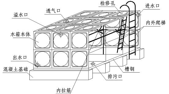 1、槽鋼底座焊接:工作人員會經過測量、找平等進行槽鋼的切割、焊接等。做成間隔 一米的格子型槽鋼底座,進行水箱的順利組裝。